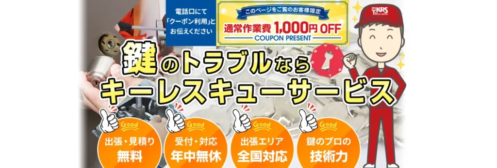 「まずはいくらかかるか知りたい」「家族と相談して決めたい」という方に最適なのが『キーレスキューサービス』です。出張費・見積もり費が0円なので、気軽にプロの診断を受けることができます。